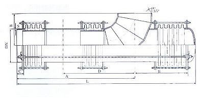 該膨脹節的兩端各有一個工作波紋管,中間有一個平衡波紋管,膨脹節通過受力構件(大拉桿或舌管)來承受內壓推力。因此管系只需中間固定支架,此類膨脹節只能吸收軸向位移。